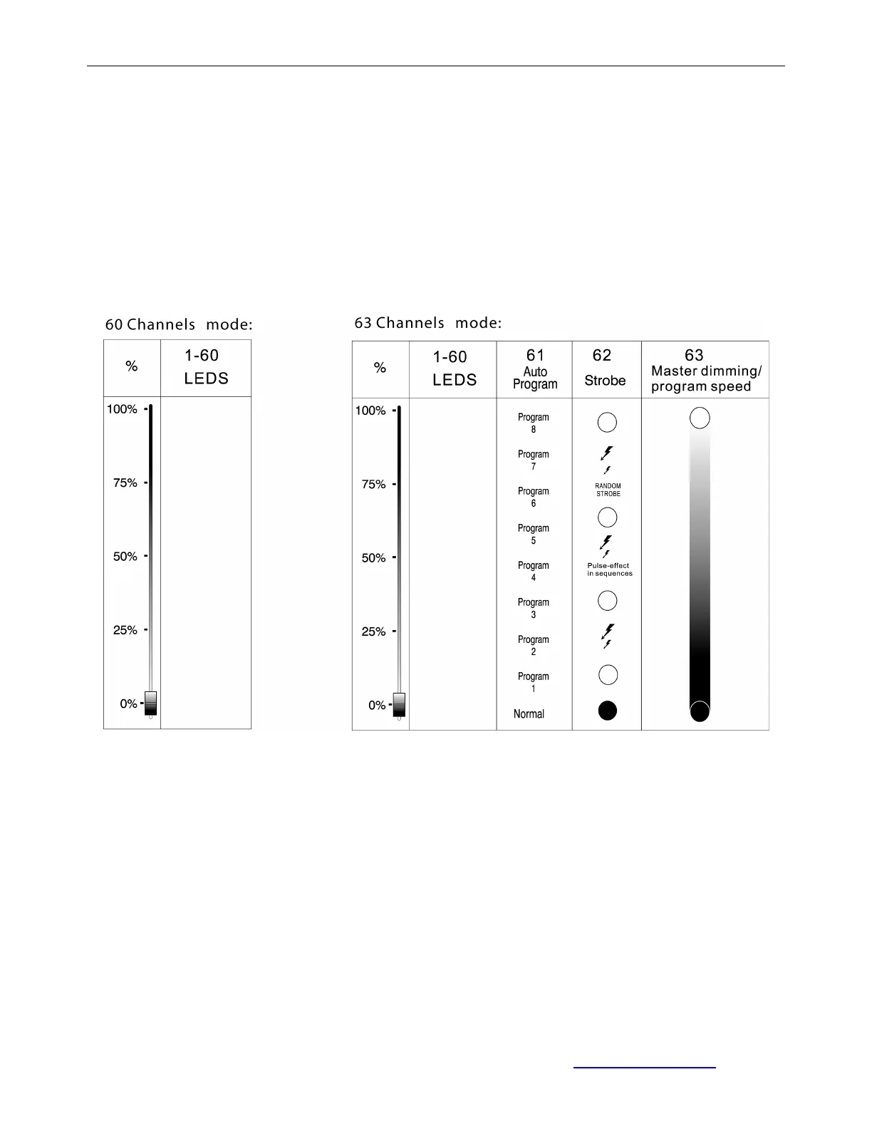 controls all like colors in blocks of 5 at a time 63-channnle mode will allow you to control