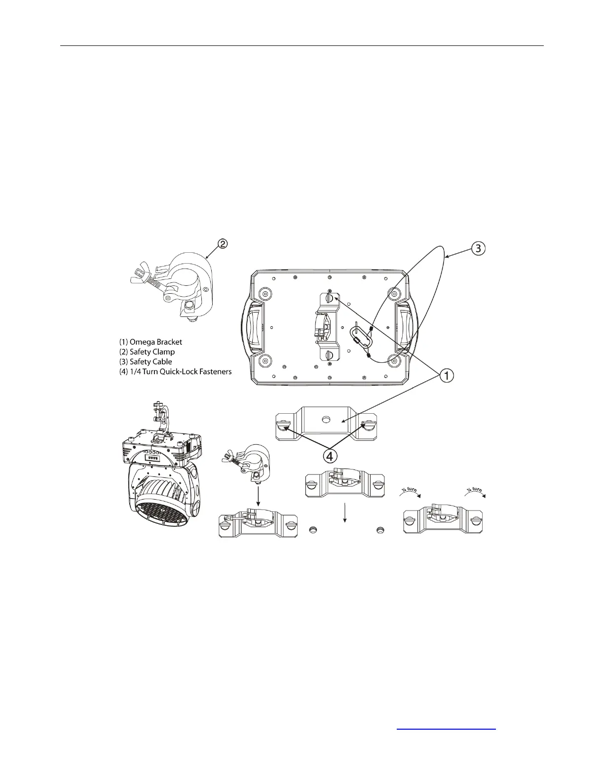 the bottom of the base, the included “Omega Bracket,” and the safety cable rigging point in