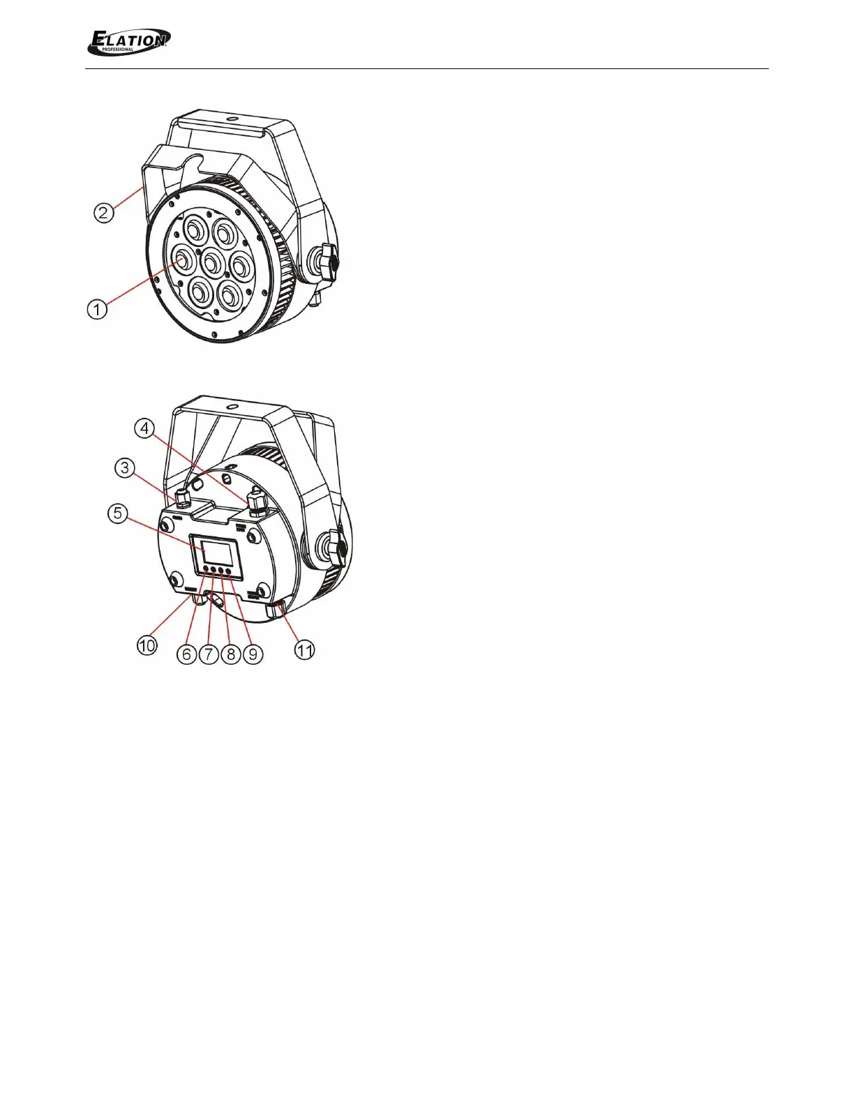 10. DMX OUT – Provides outgoing DMX signal via a female 5-pin XLR jack.