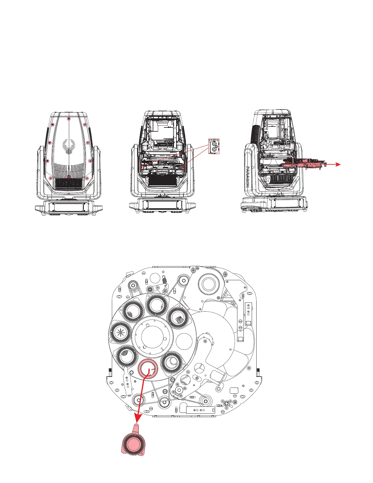 Locate the four (4) fasteners securing the gobo module in place (center), then disconnect