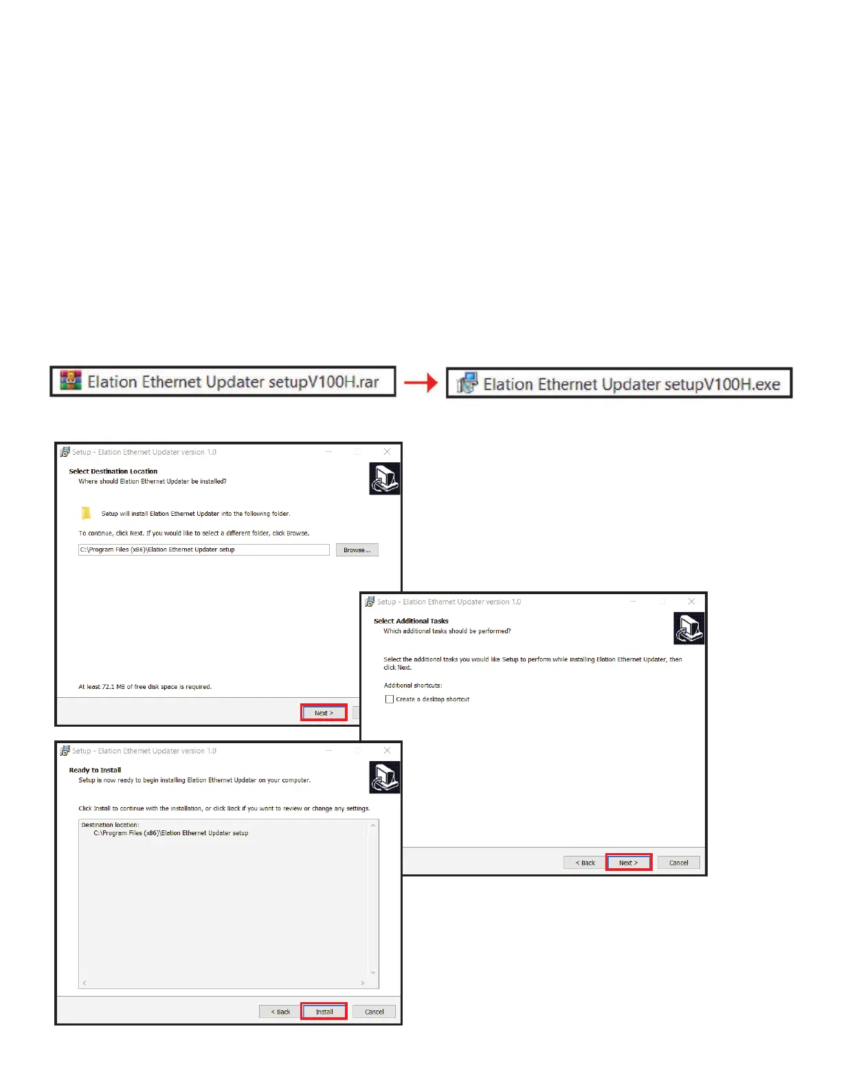 extract the EXE le. With the le extracted, click Elation Ethernet Updater setupV100.exe to