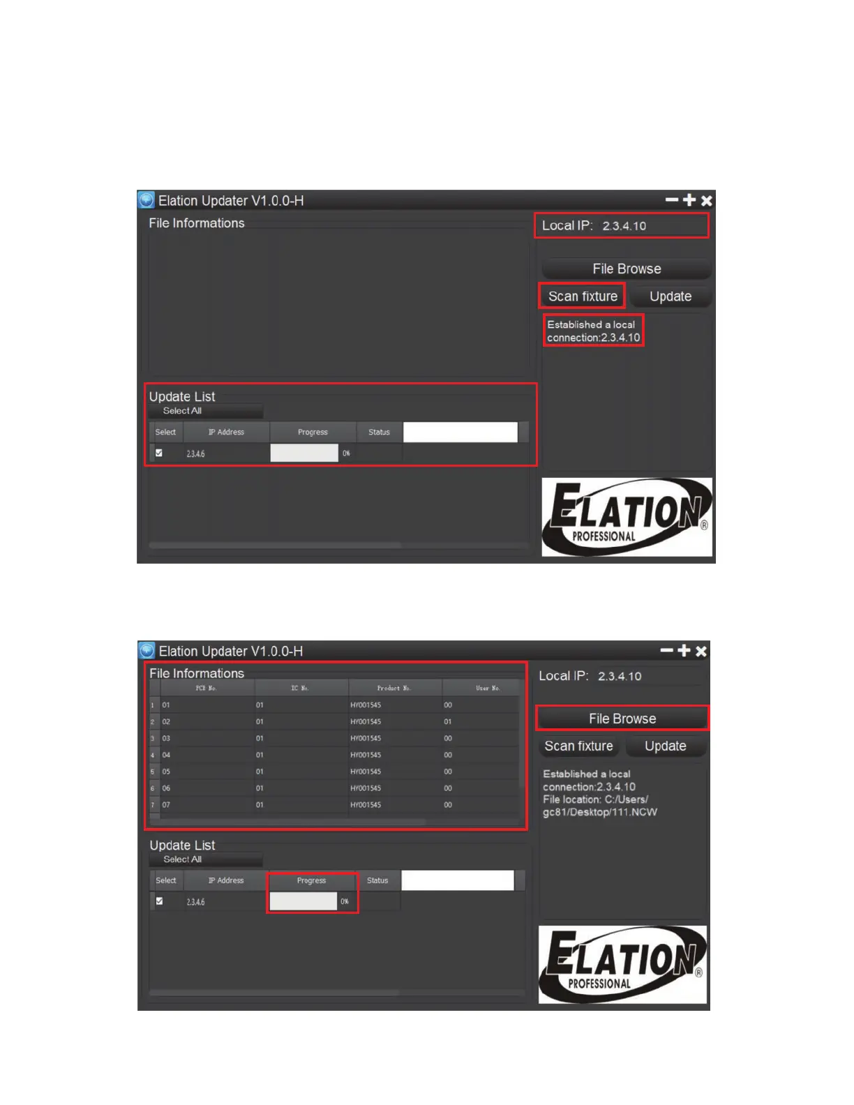 connection. The xture identity will appear in the Update List on the left side of browser. A