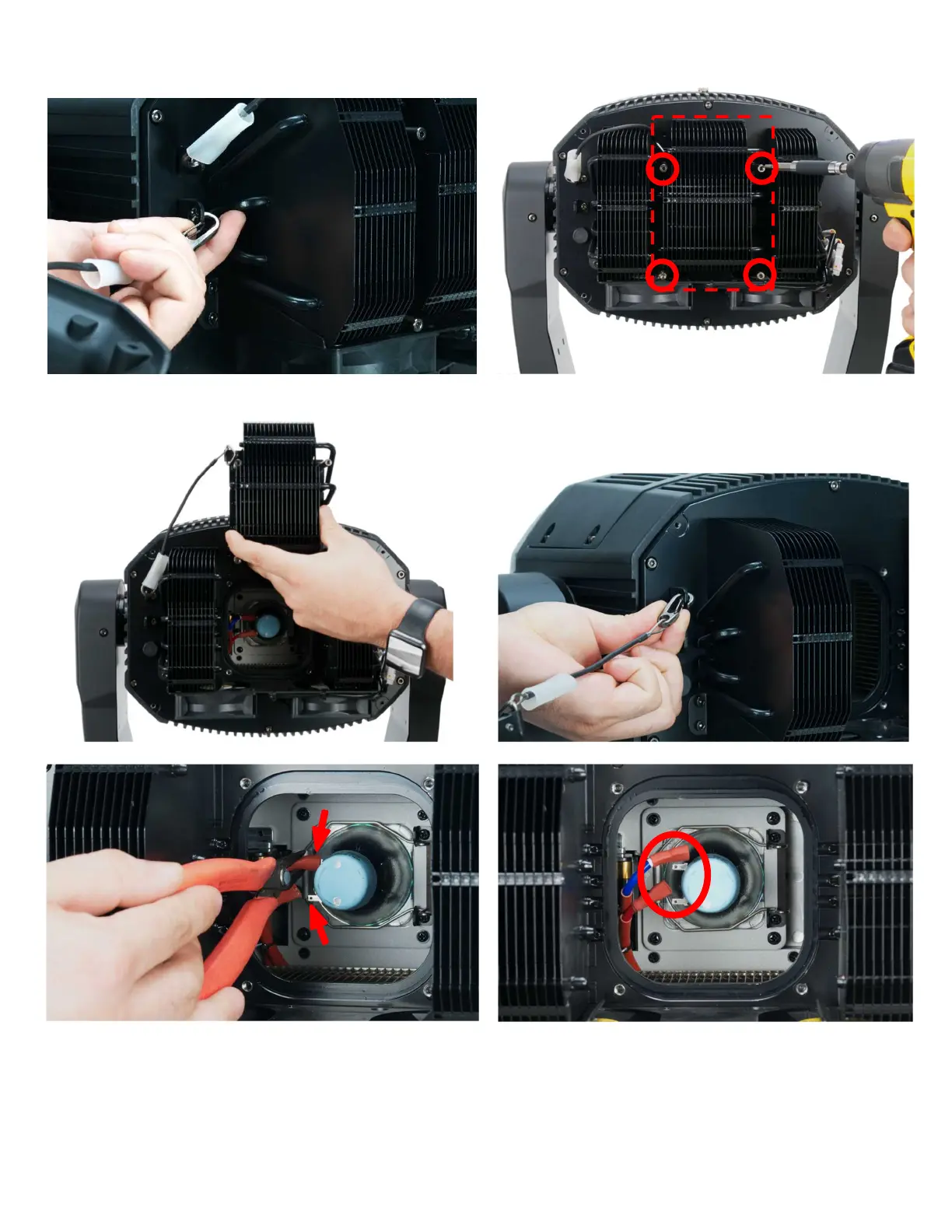 4. Unclip the rear cover safety cable. 5. Remove (4x) 3mm hex-head screws holding the