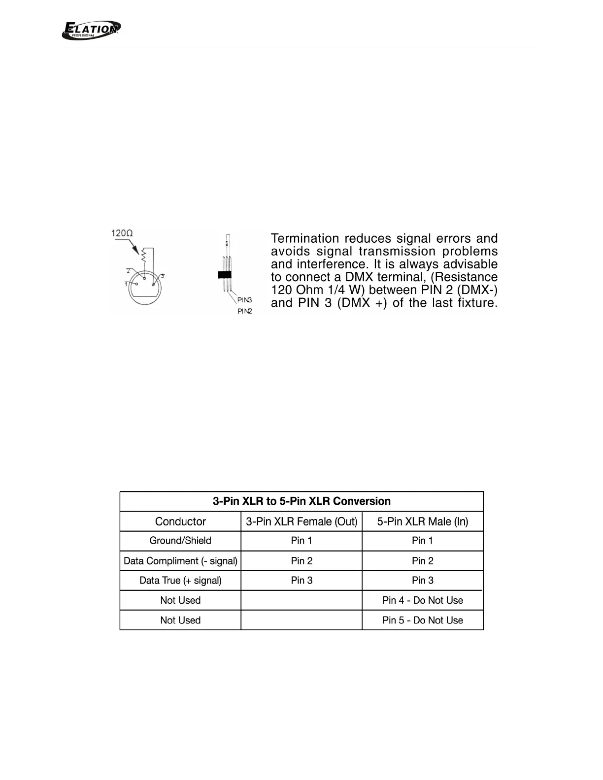chain to terminate the line. Using a line terminator (Elation part: DMX T PACK) will decrease