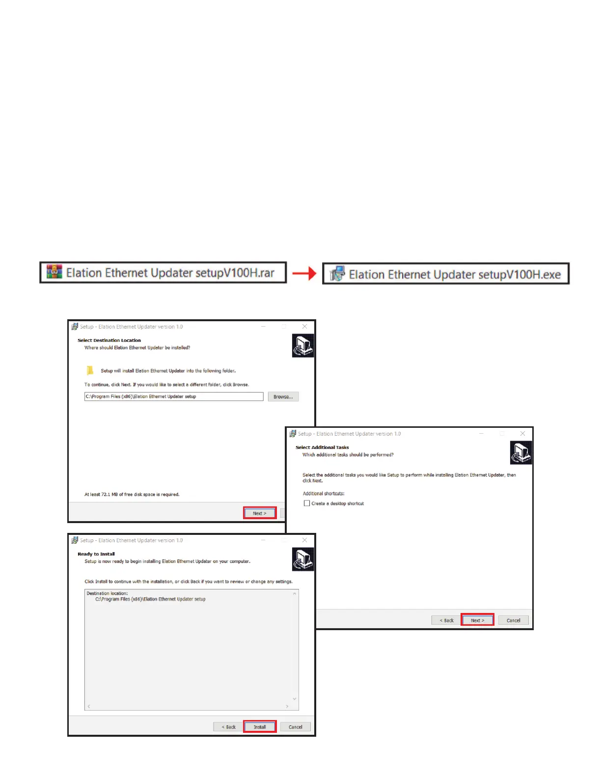 extract the EXE le. With the le extracted, click Elation Ethernet Updater setupV100.exe to
