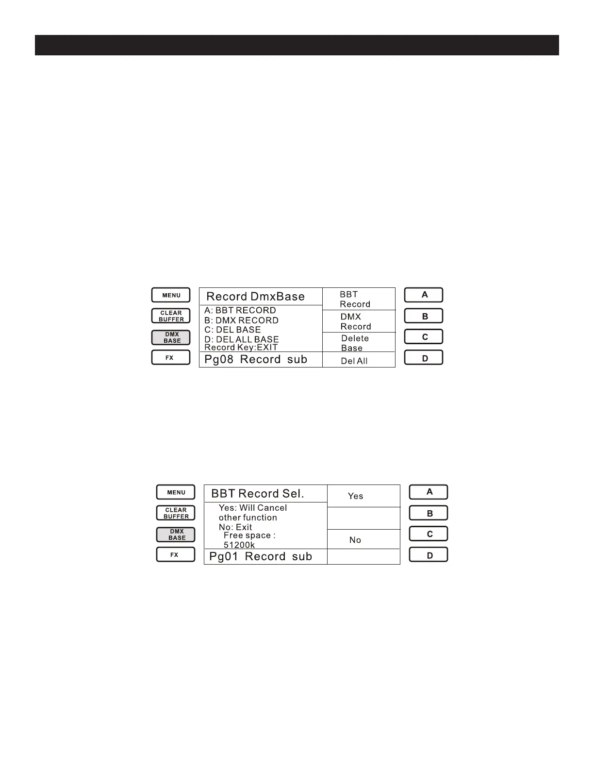 To choose DMX Record, Press the A key to confirm, then Select “Start”. The console will then begin