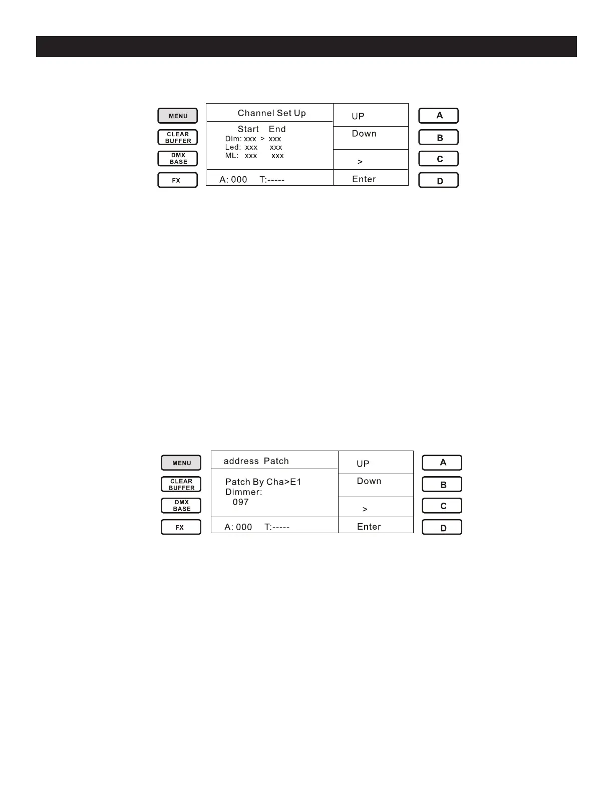 Used to assign the DMX channels for each fixture type (Dimmer, LED and ML). The “Up”, “Down”,