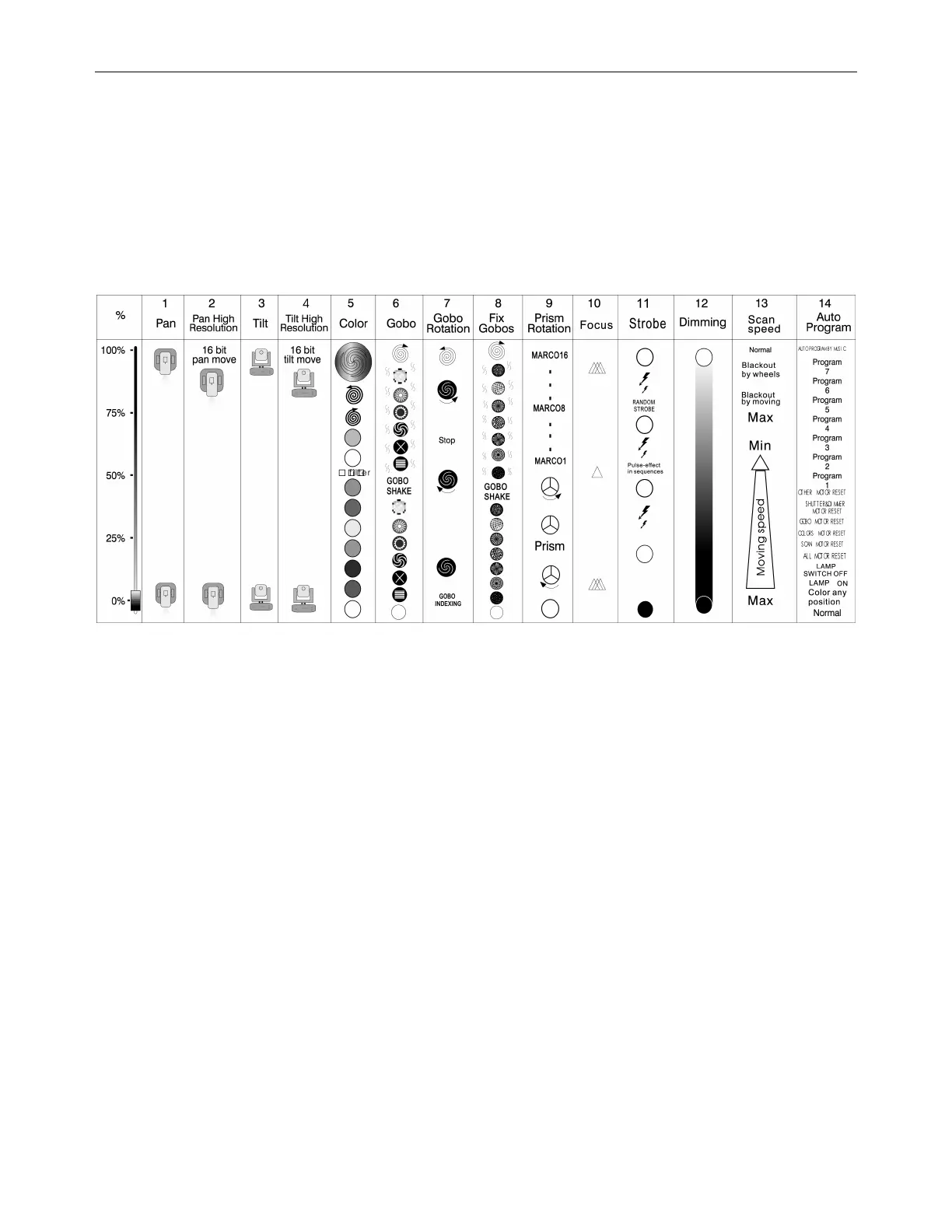 The chart below details the channel layout for 14 DMX channels (default).