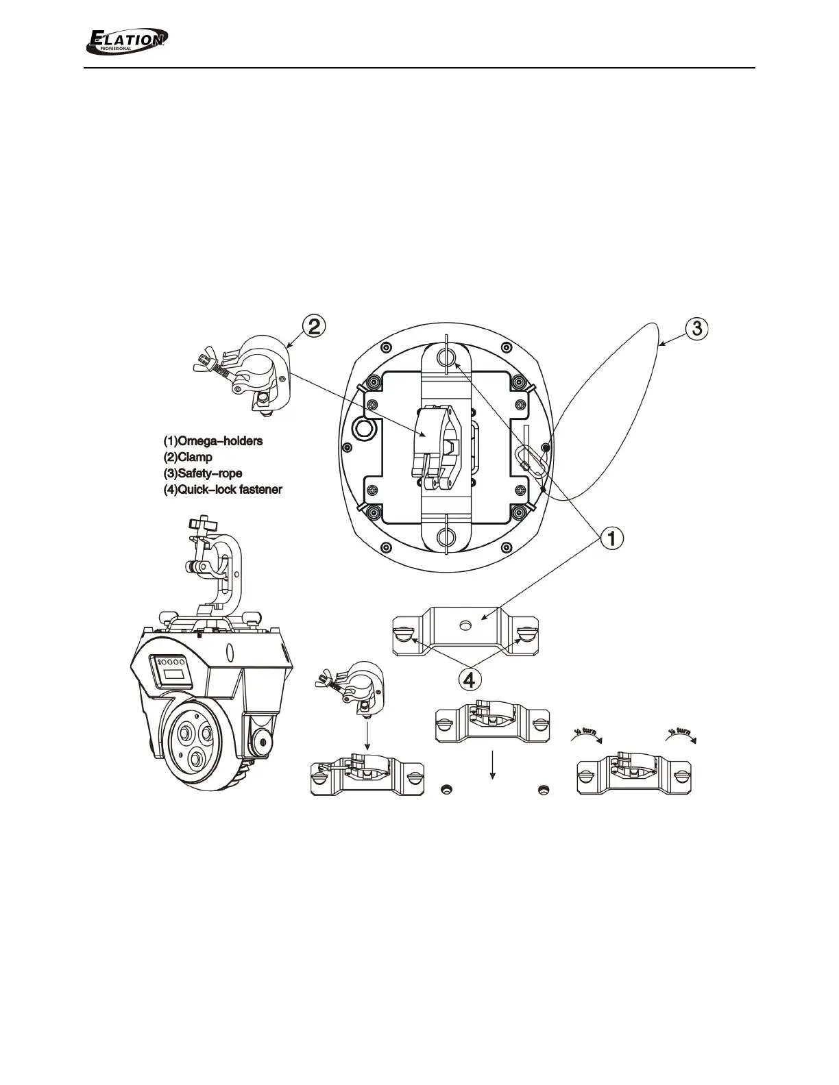 bottom of the base, the included Omega Bracket and safety cable rigging point in