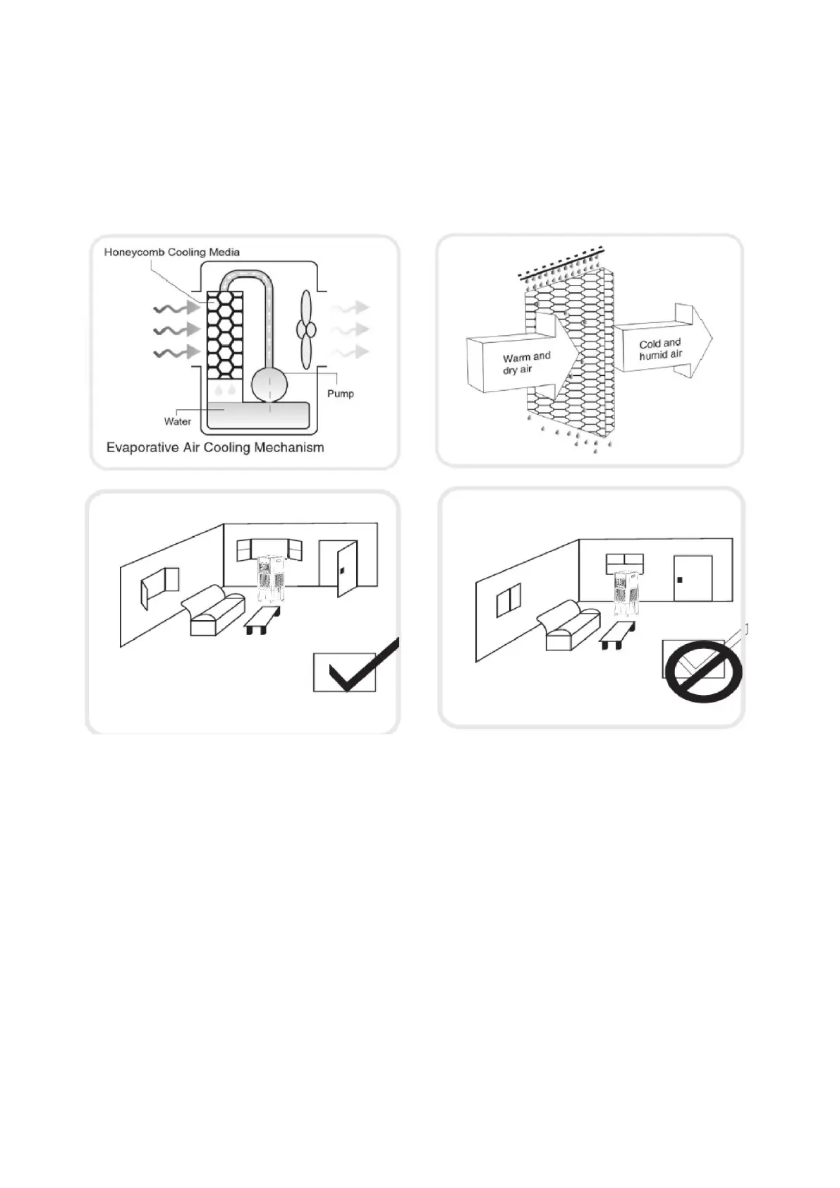 • The evaporative air cooler should not be used in enclosed or sealed spaces. It must be