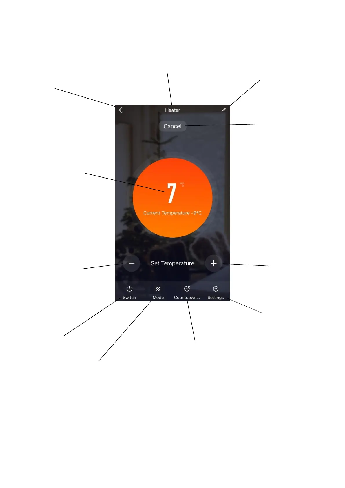 The device screen is the main control screen for the heater, providing access to the controls to