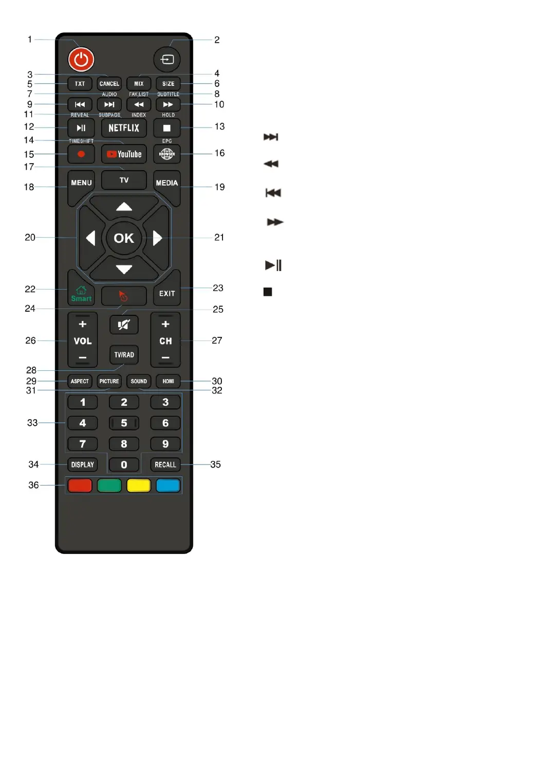 13. (MEDIA mode): Press to stop playback. EPG: Enter or exit the
