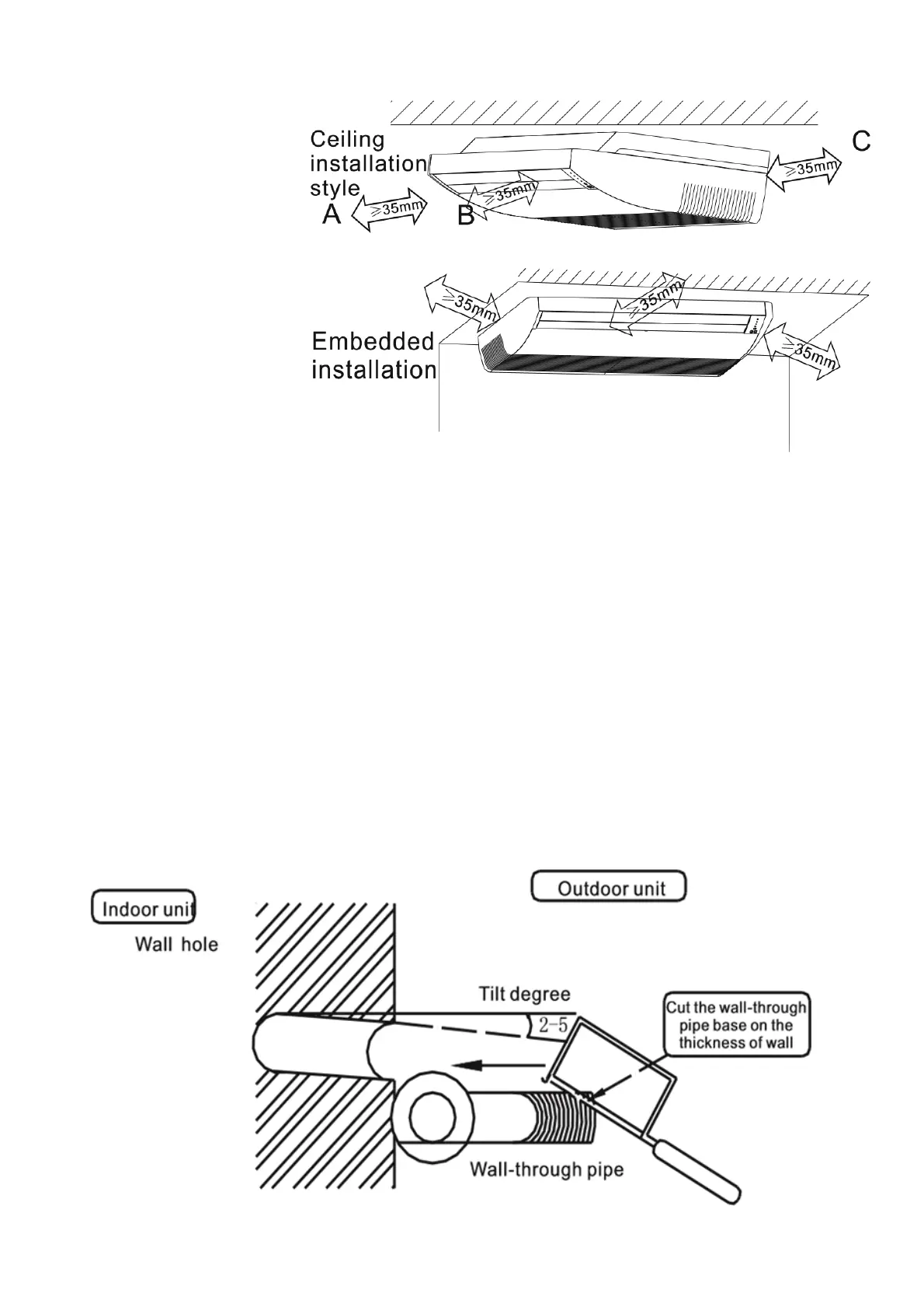 Make sure that there is a minimum of 35 mm clearance in all directions A, B, C.