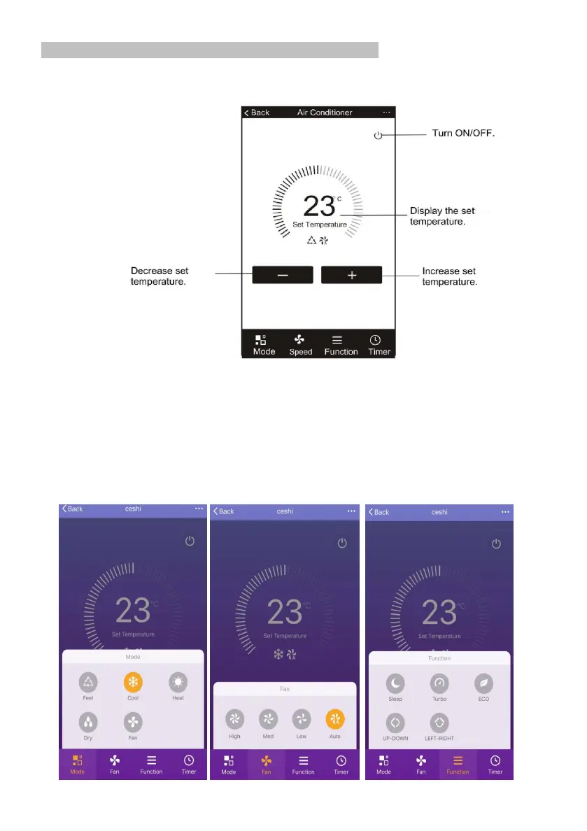 Mode: Allows the operating mode to be changed between Feel, Heat, Dry, Cool and Fan.