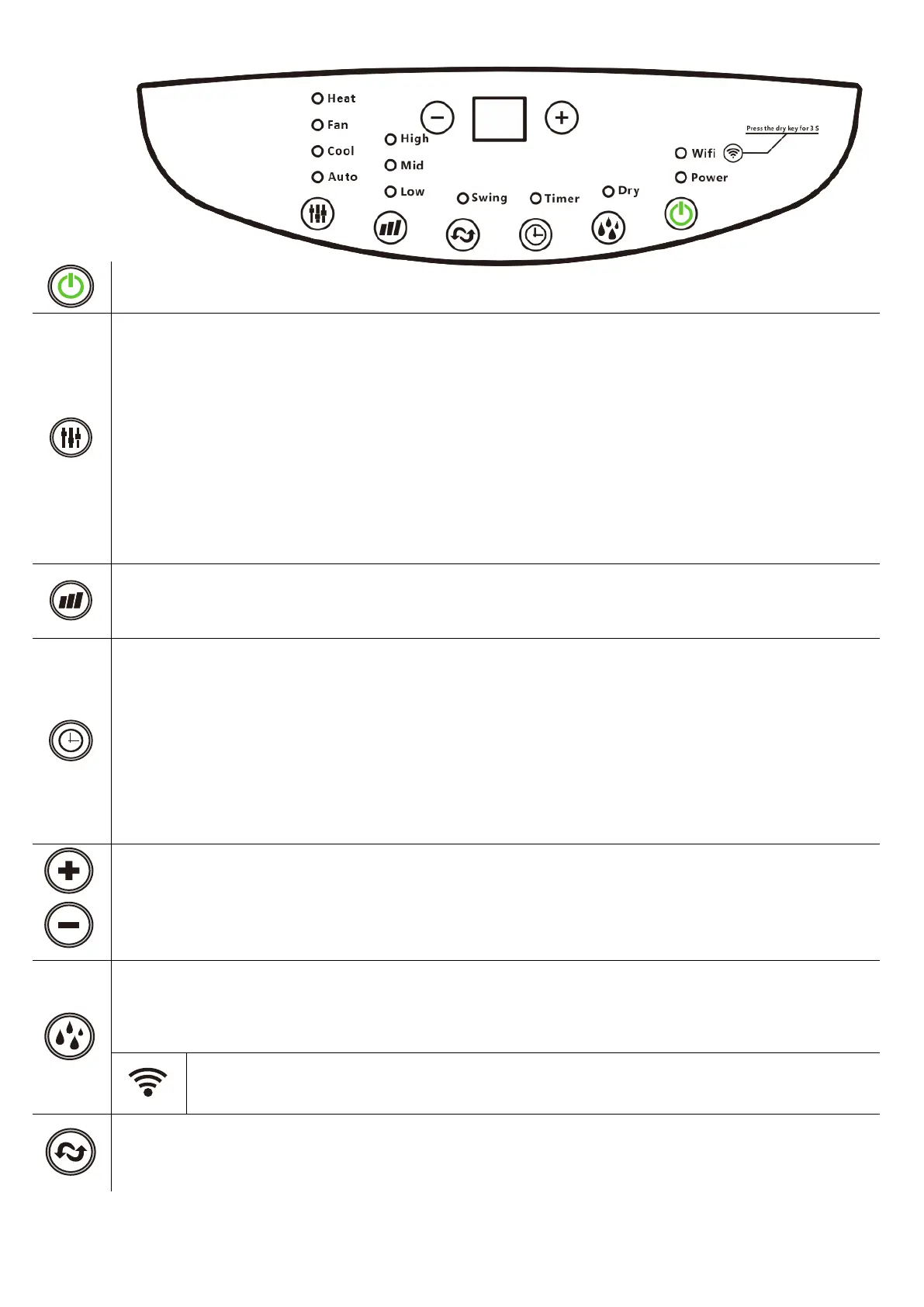 Press and hold the DRY button to turn on the WIFI function or to change between WIFI