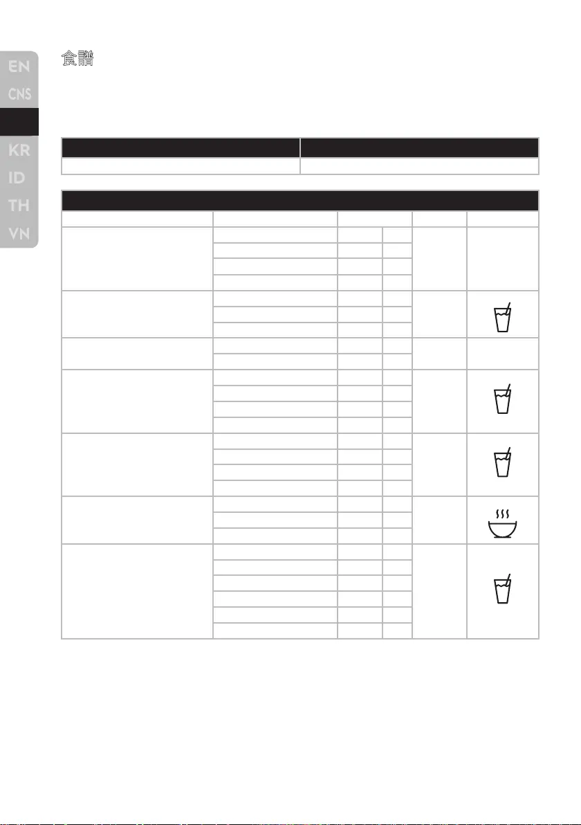 下表列出了Master 9果汁機的參考食譜,供您參見。