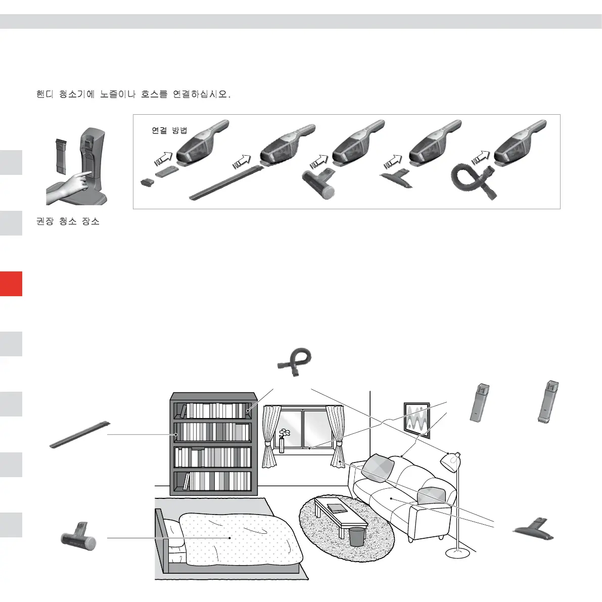 청소할 장소에 따라 핸디 청소기에 적절한 노즐이나 호스를 연결하십시오.