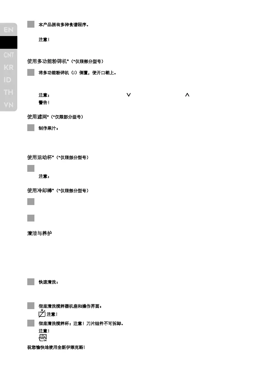 注意!5秒钟内若没有使用,搅拌机将会自动进入睡眠模式。 若要继续使用,请按任何一个按钮,随后便