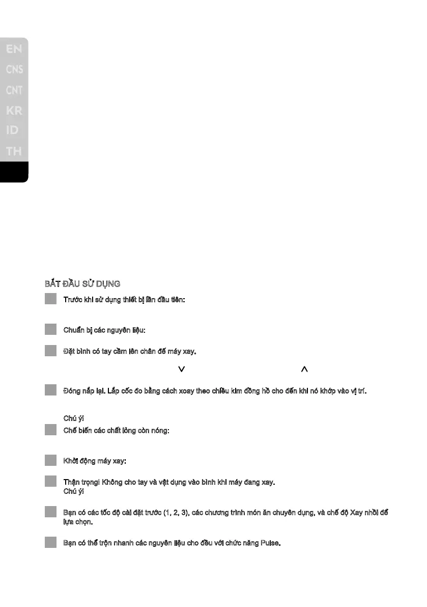 Thận trọng! Không cho tay và vật dụng vào bình khi máy đang xay.