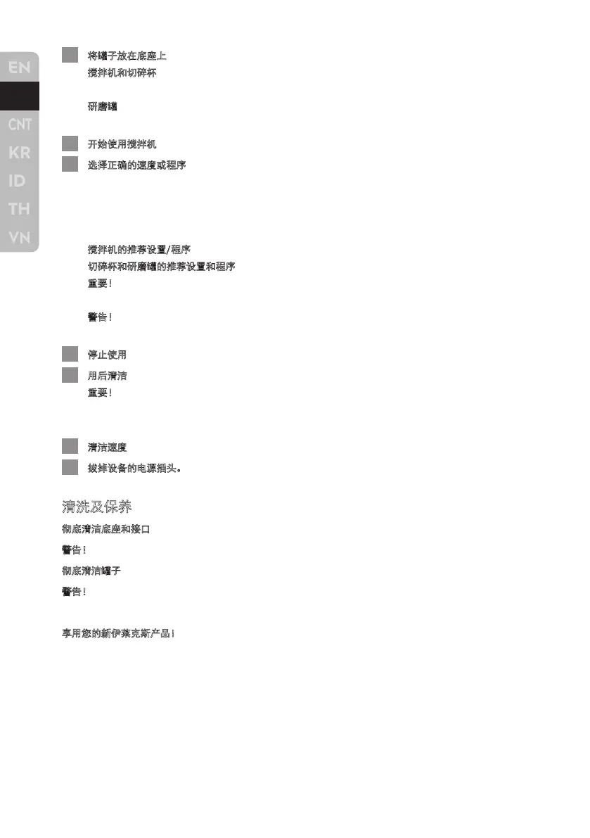 警告!产品运行期间切勿取掉量杯或盖子。切勿让搅拌机空转,搅拌机空转会导致产品过热,损坏产品。