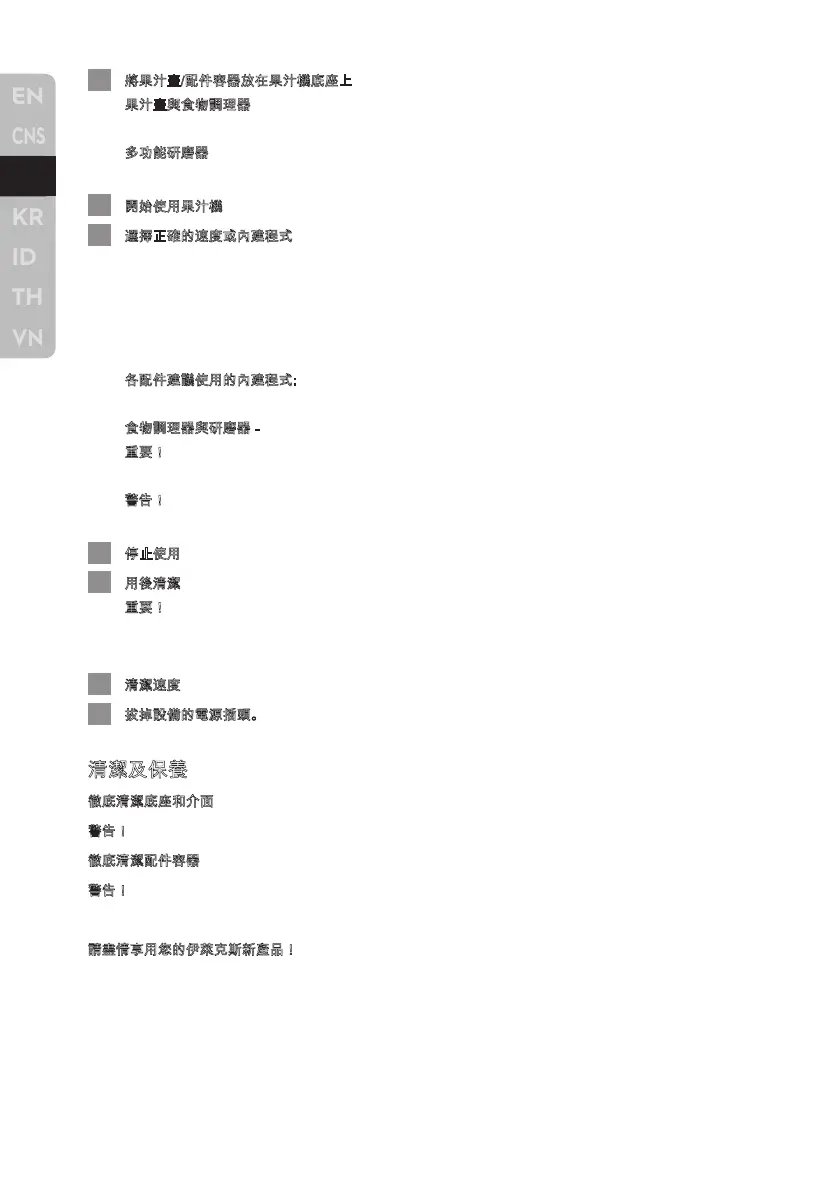 警告!產品運行期間切勿取掉量杯或蓋子。切勿讓果汁機空轉,果汁機空轉可能導致產品過熱及損壞商