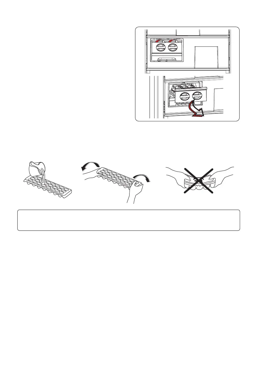 • Når vannet har frosset helt, kan du vri på isterningsbrettet som vist nedenfor for å løsne