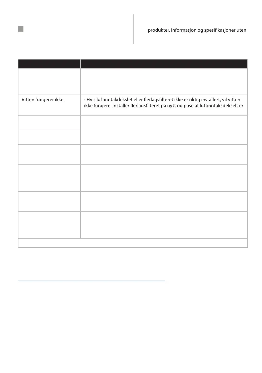 Luftrenser ikke i drift. • Undersøk om stikkontakten er frakoblet. Dytt støpslet ordentlig inn i