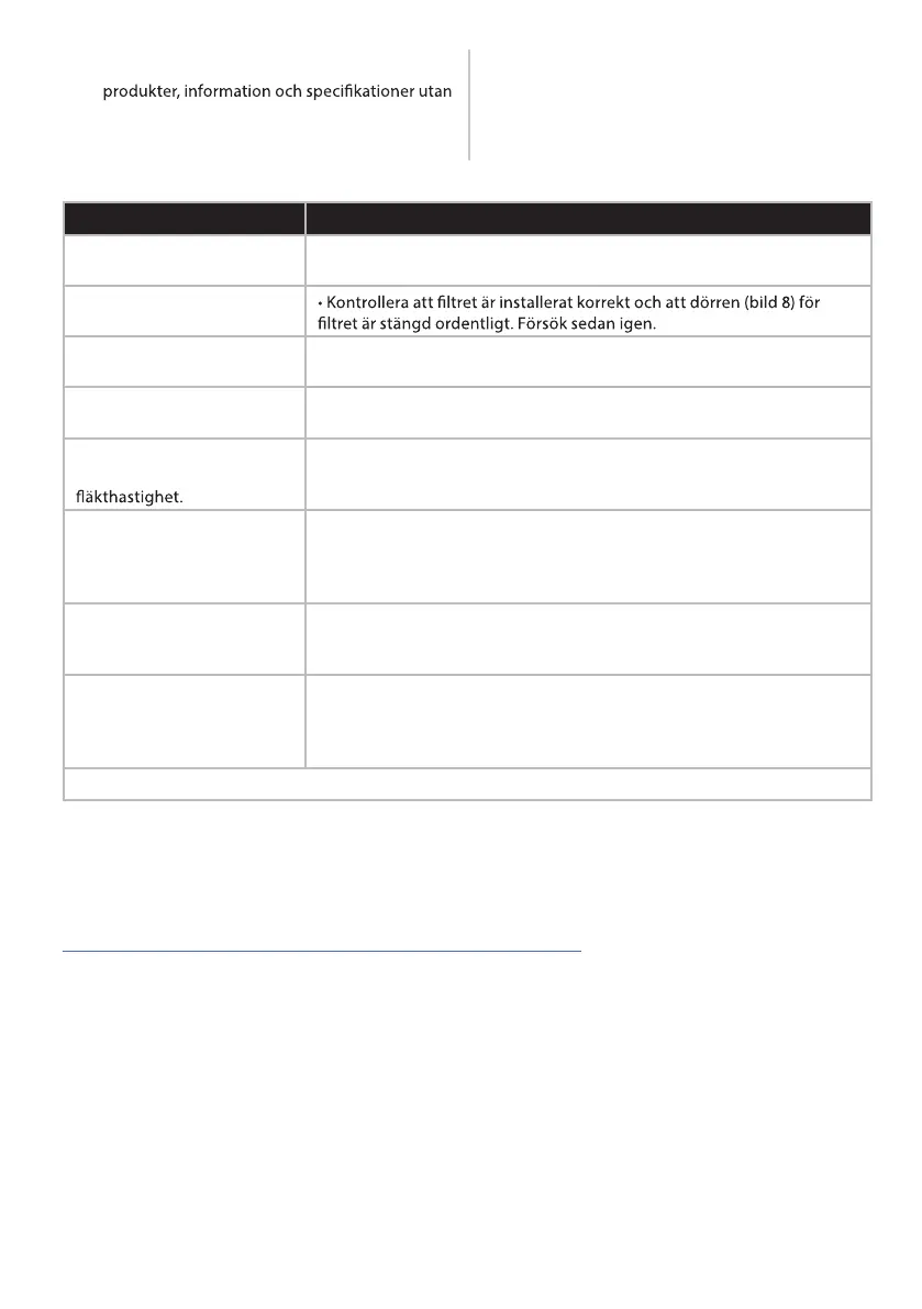 Luftrenaren fungerar ej. • Kontrollera att stickproppen är ordentligt isatt i el-uttaget