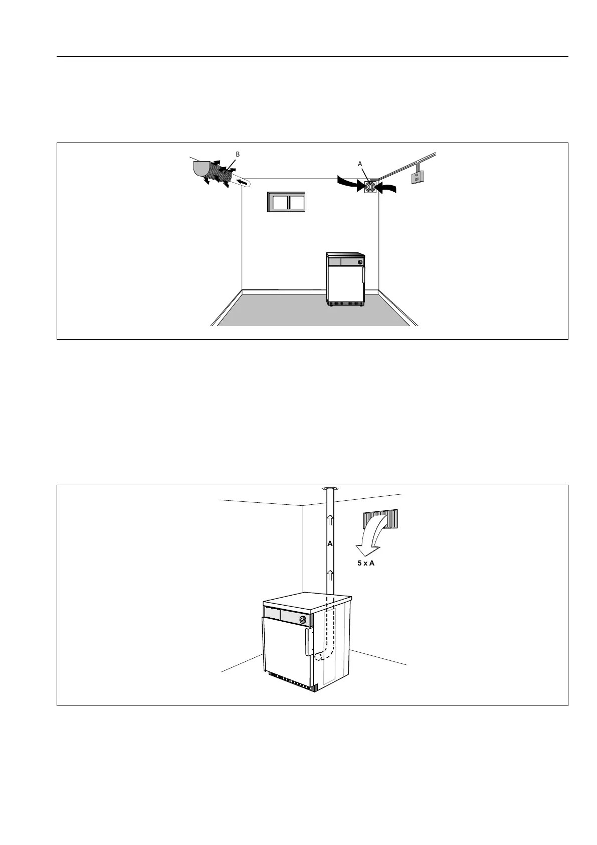The fresh air intake (B) must end in the room in front of the machine positioned diagonally from the fan.