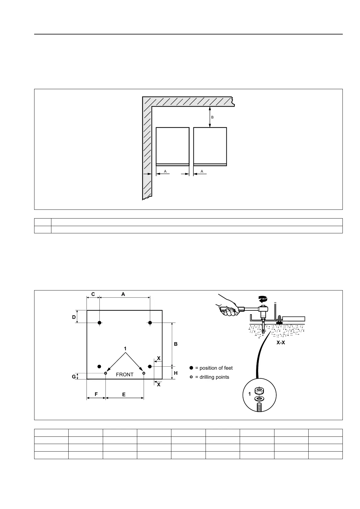 The figure shows minimum distance to a wall and/or other machines. Failure to respect the prescribed distances will