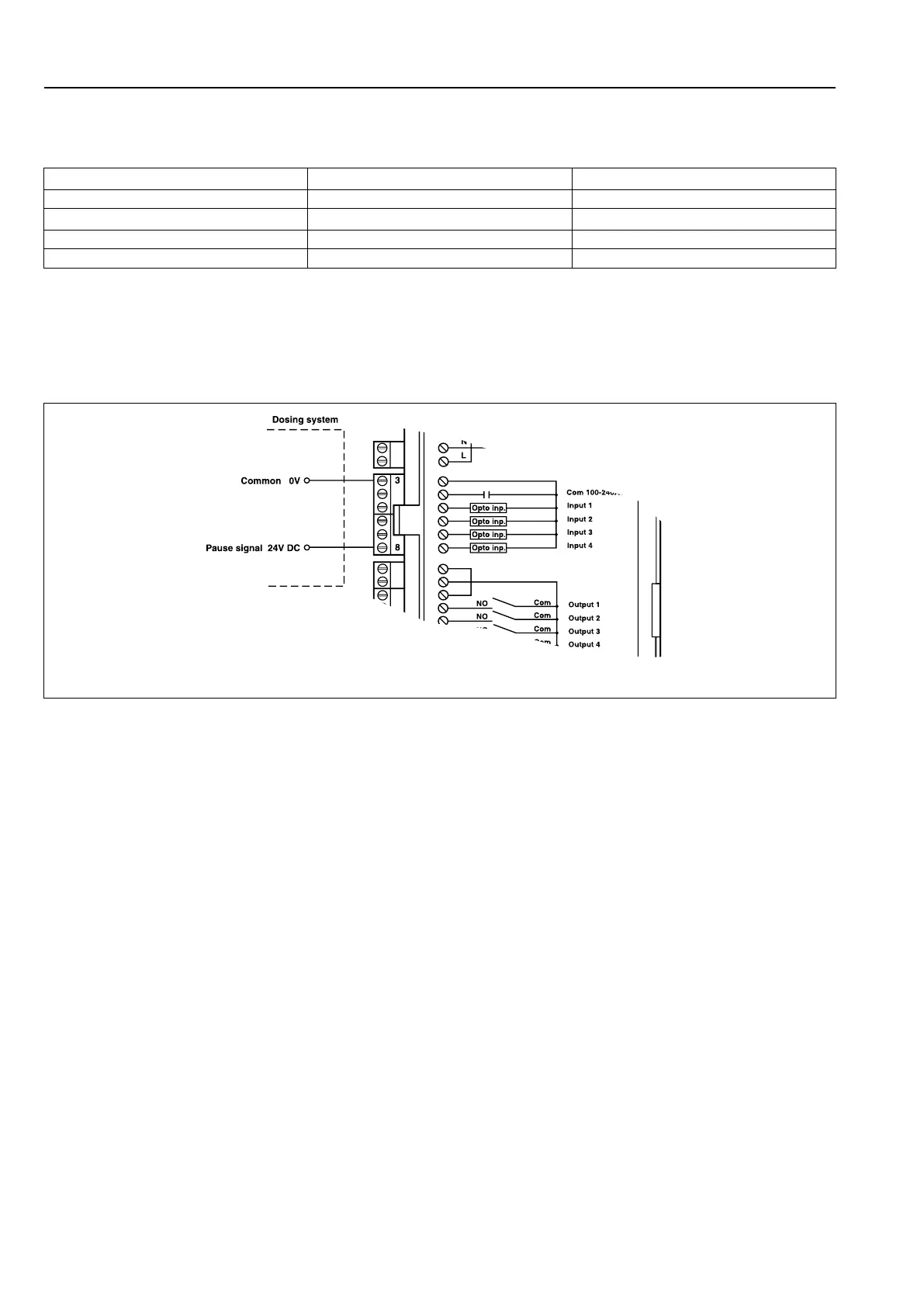 De afbeelding toont een voorbeeld van het aansluiten van een pauzesignaal van 24 V. Het programma pauzeert zo-