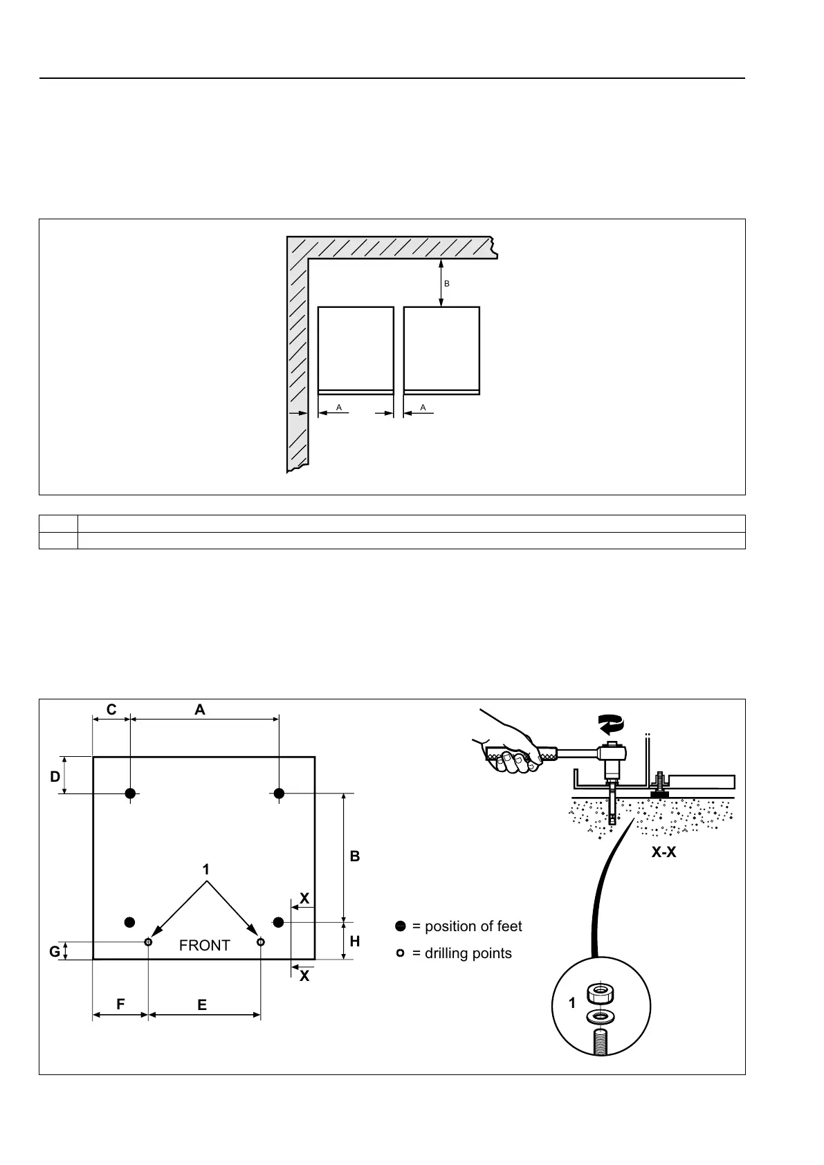 De tabel toont de correcte positie van de voetjes en boorpunten.