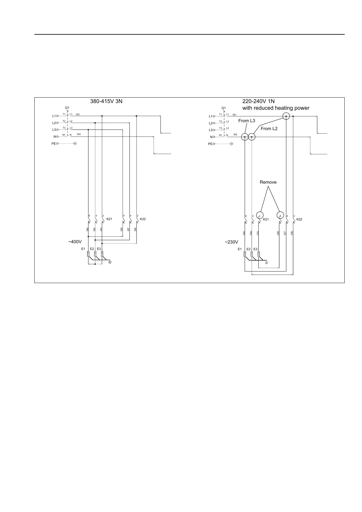 Verwijder de kabels die zijn aangesloten op K21:2 en K22:6. Verplaats de resterende kabels van L2 en L3 naar L1 of