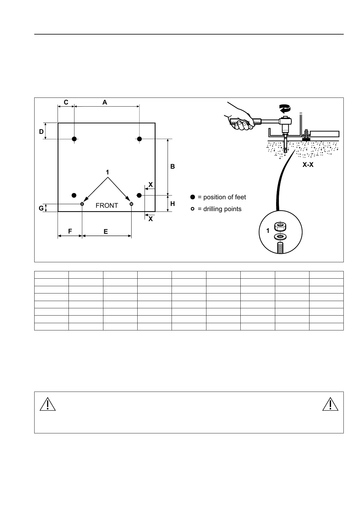 The table shows the correct position of feet and drilling points.