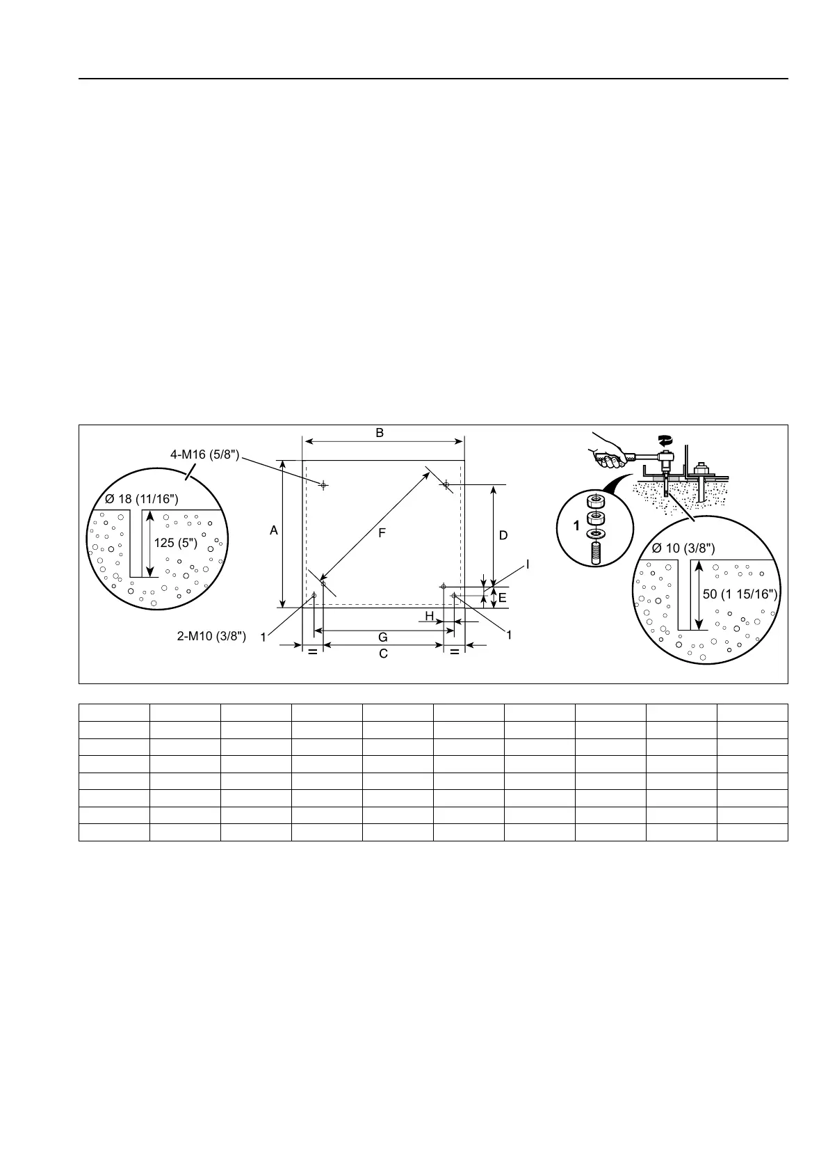 The machine must be securely fastened to a suitable foundation using 4–M16 (5/8 inch) threaded rod, heavy duty flat