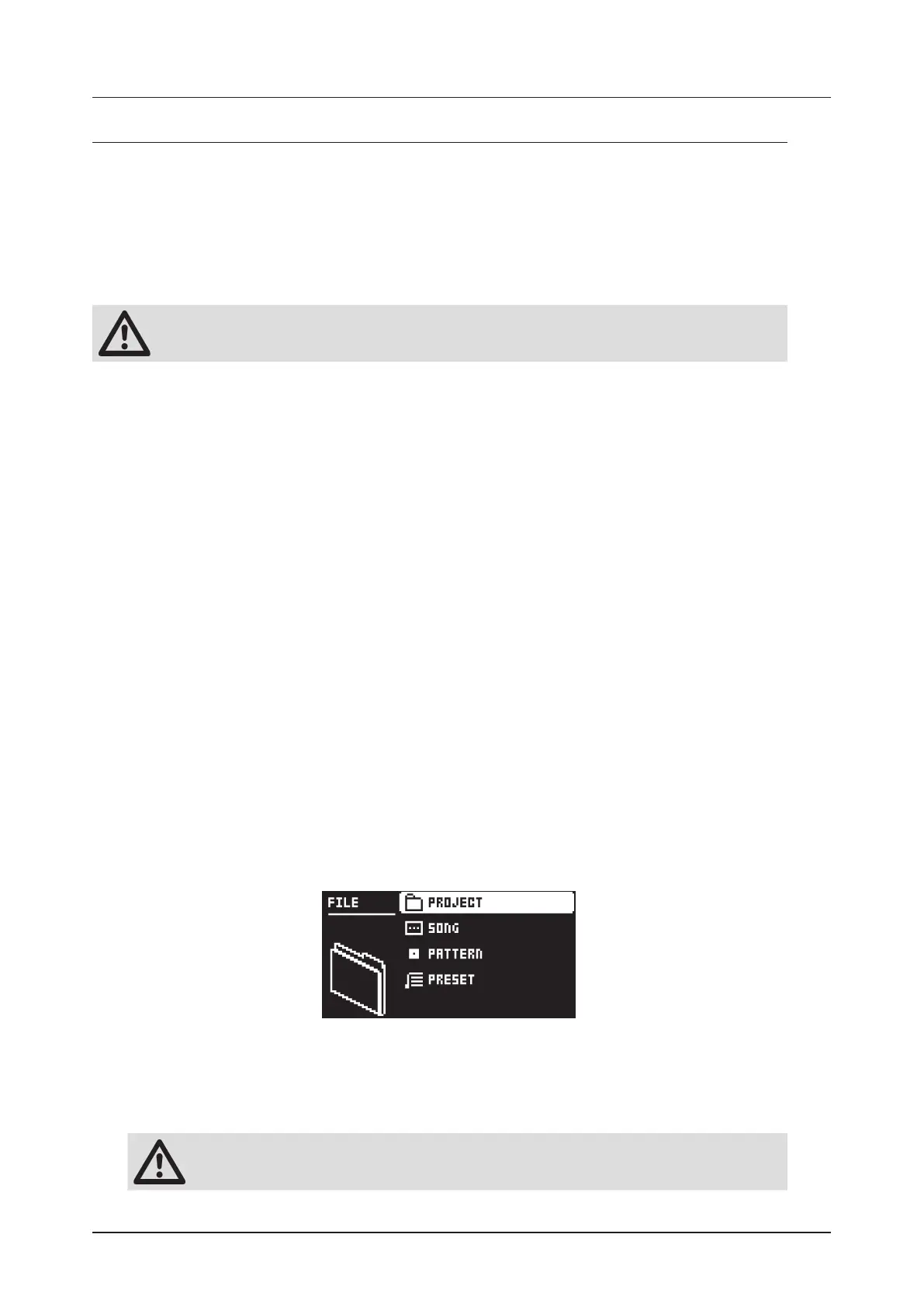 Press [FUNC] + [PRESET] to open the FILE menu. Here you manage projects, songs, patterns, and pre-