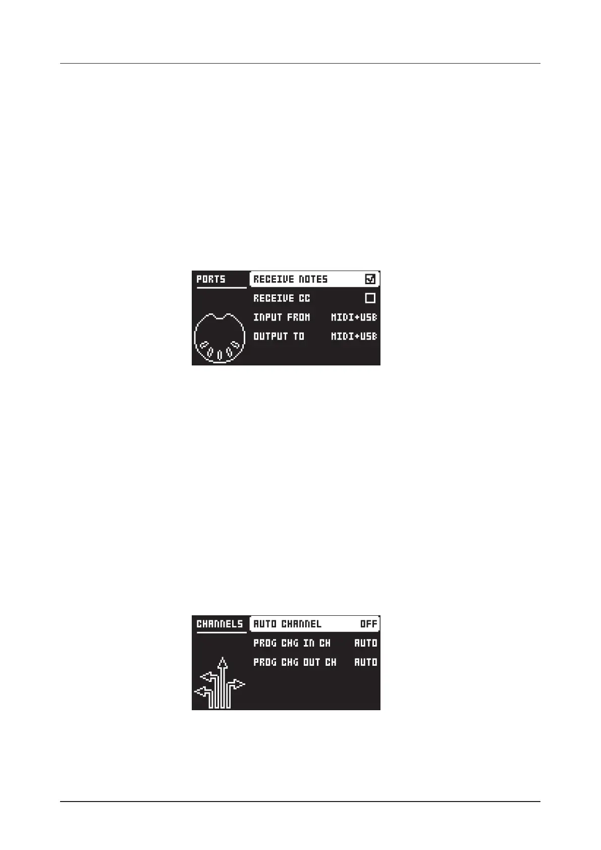 Here you find the MIDI port-related settings. Change settings by using the [LEFT]/[RIGHT] arrow keys.