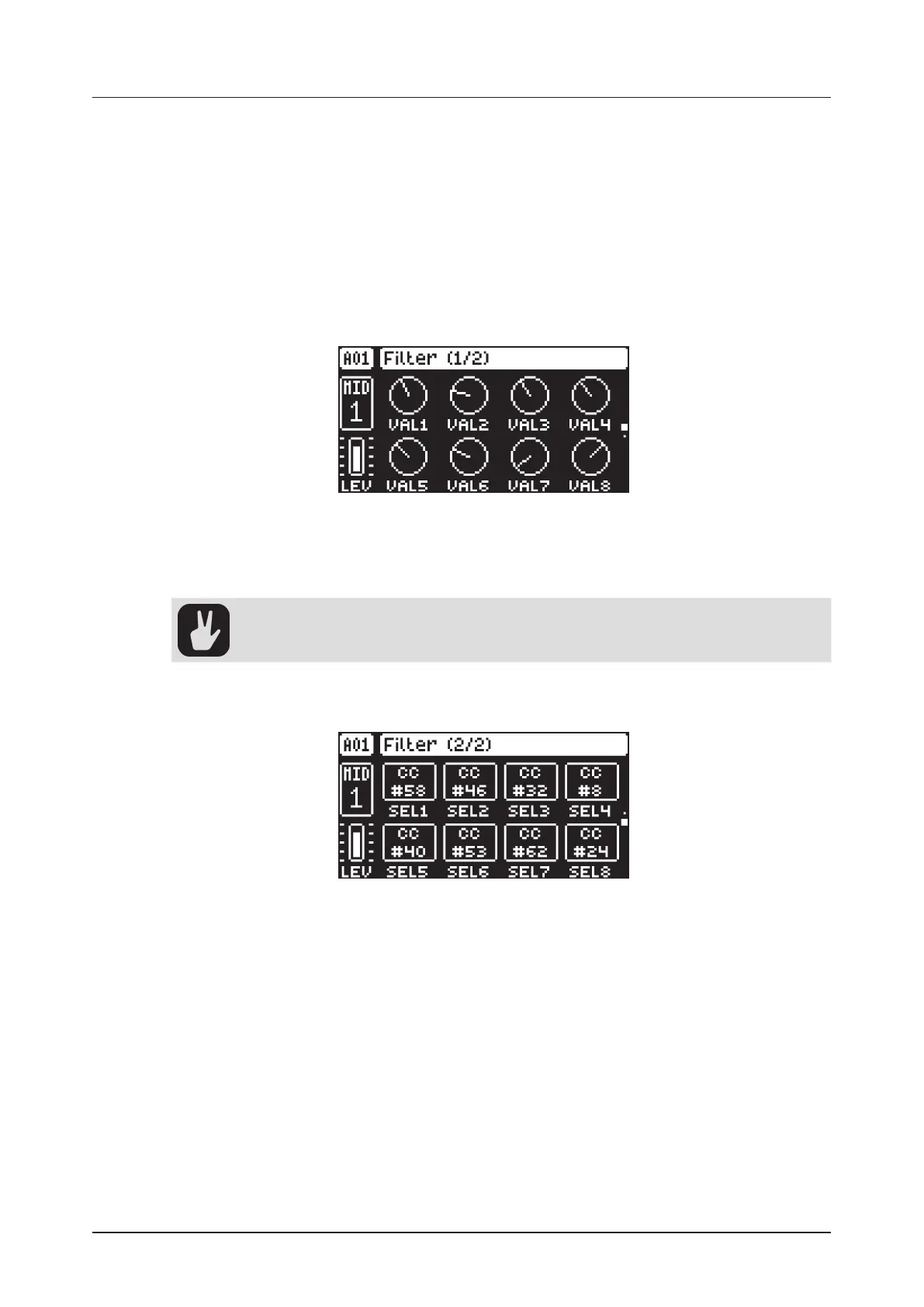 Here you select the first eight CC commands whose values you set with the parameters on the FLTR