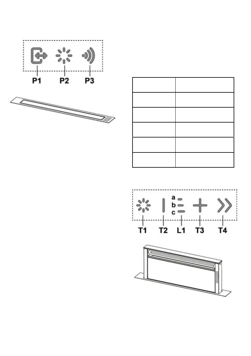 P1. Tast for åpning/lukking av avtrekkspanel.