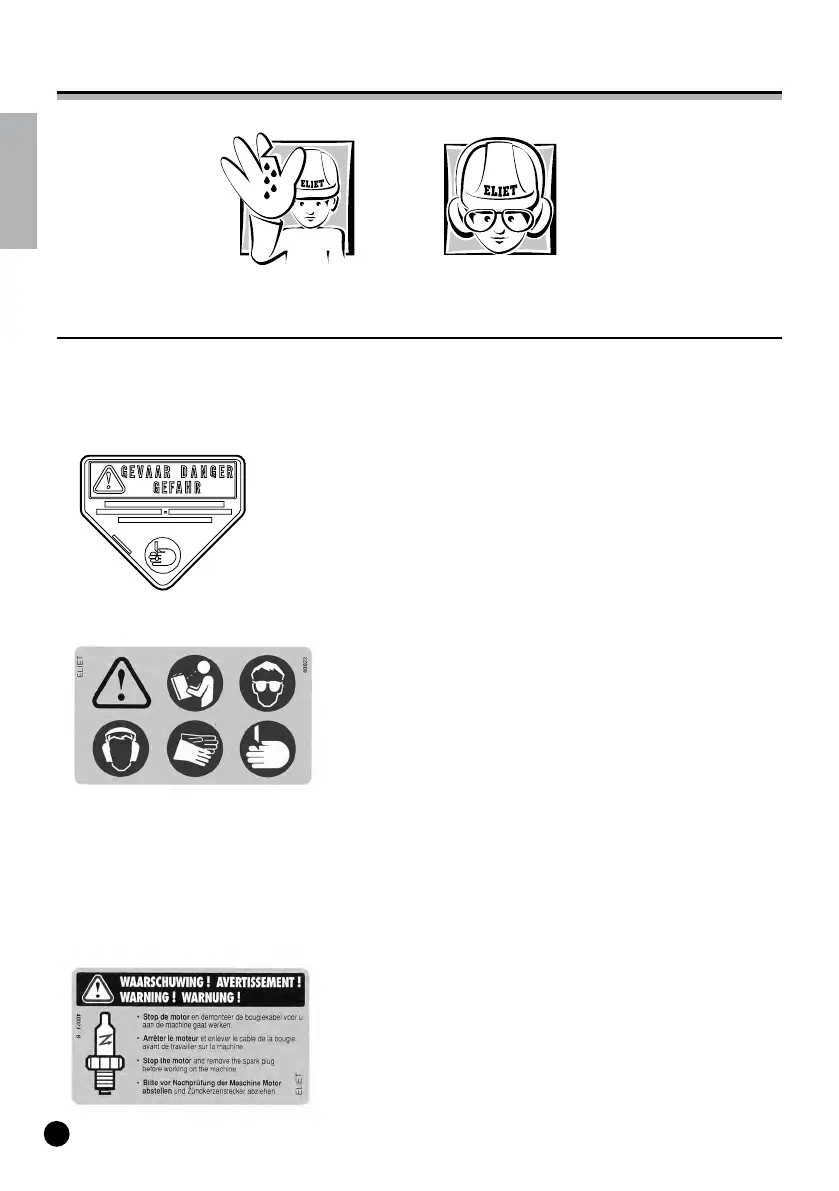 The safety messages are clearly indicated on the machine with stickers or relief pictograms. Take