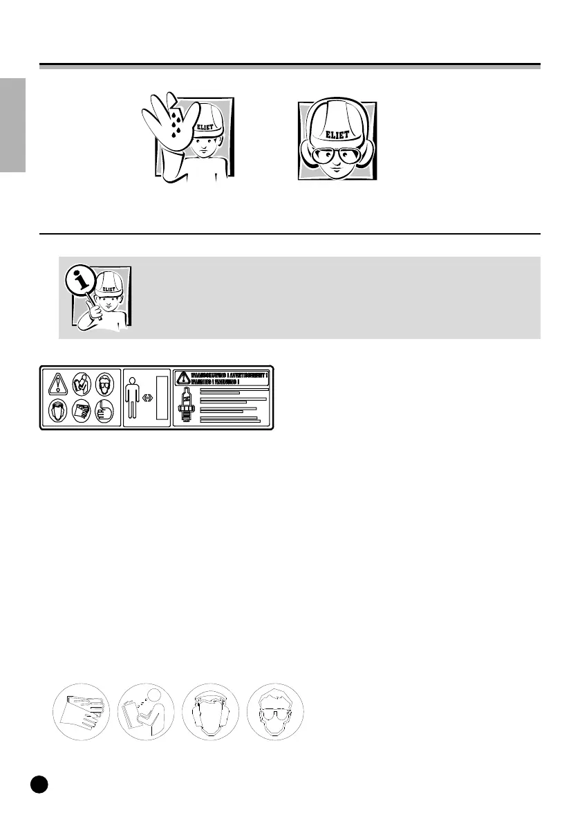 Het eerste deel van de sticker vat de algemene veiligheidsvoorschriften samen d.m.v. iconen:
