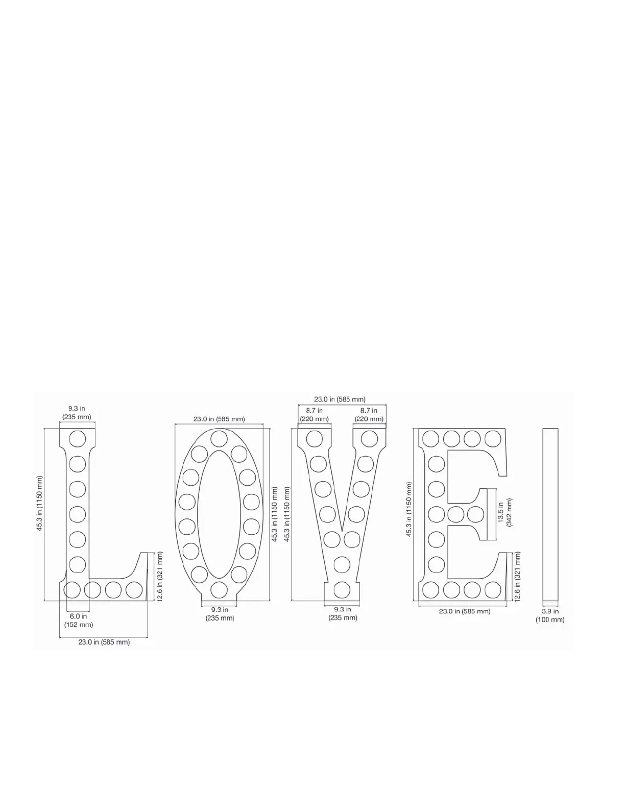 Dimensions: Each Letter: 45.3” (1150mm) height x 23.0” (585mm) length x 3.9” (100mm) width