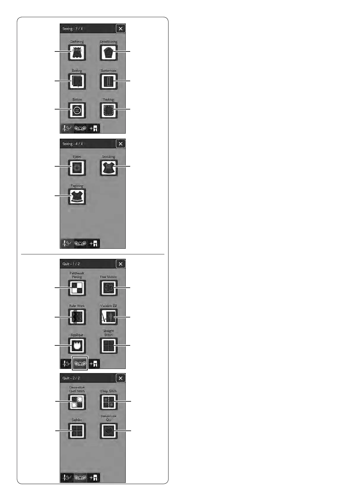 Press the quilt key and the quilt sewing application menu