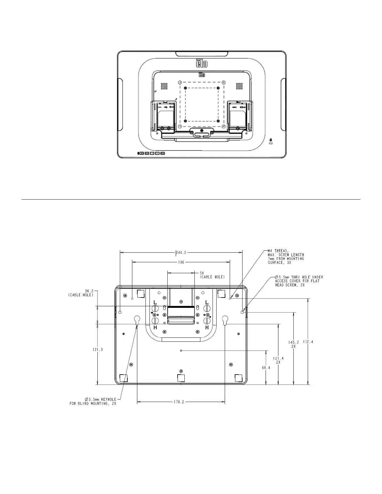 For the 1502L touchmonitor, a threaded three-hole mounting pattern for M4 screws is provided