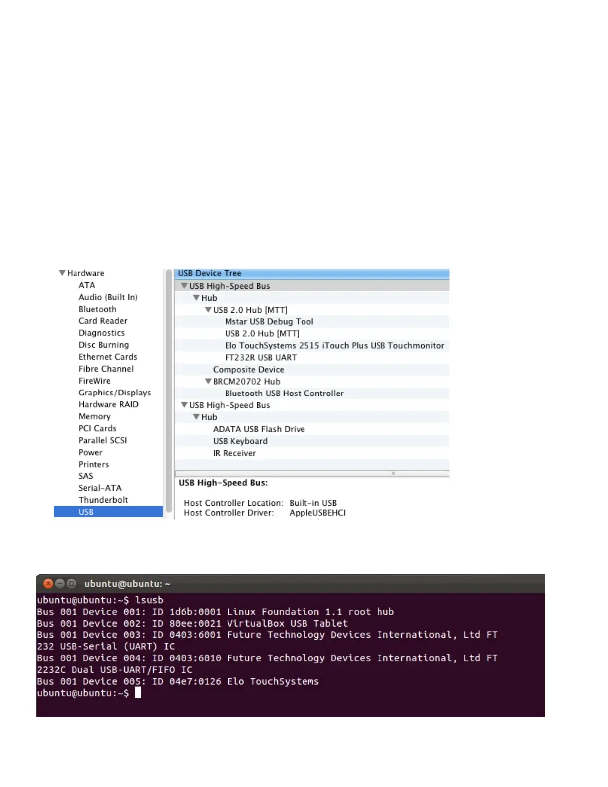 - Open a Terminal window and type “lsusb” as the command. A screen that looks like below will