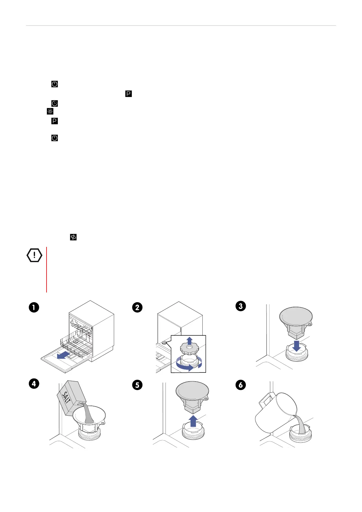 • Only use salt specifically intended for dishwasher use. Any other type of salt, especially table salt, will