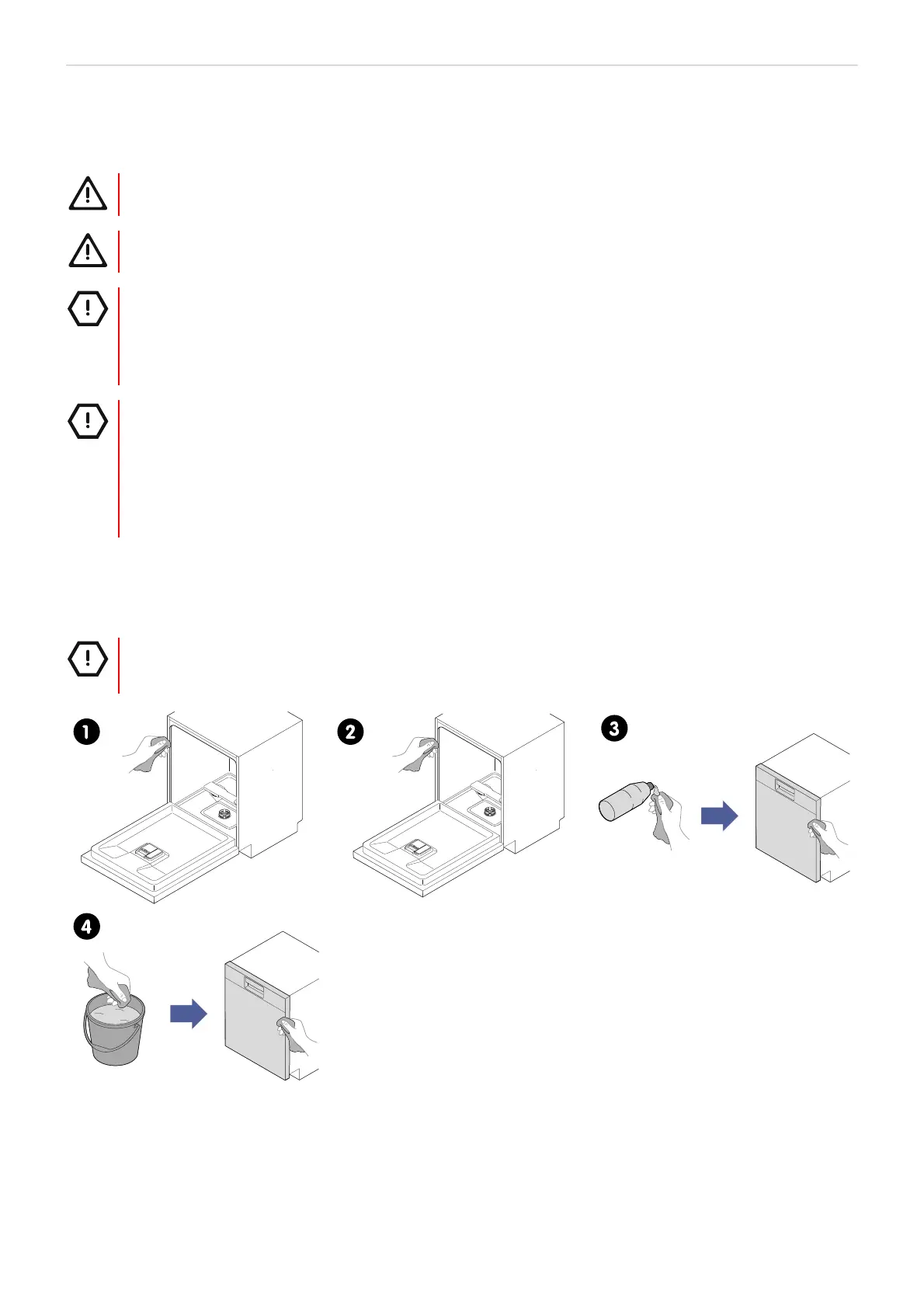 1. Clean the door seals and sides using a soft cloth dampened with soapy water or diluted detergent.
