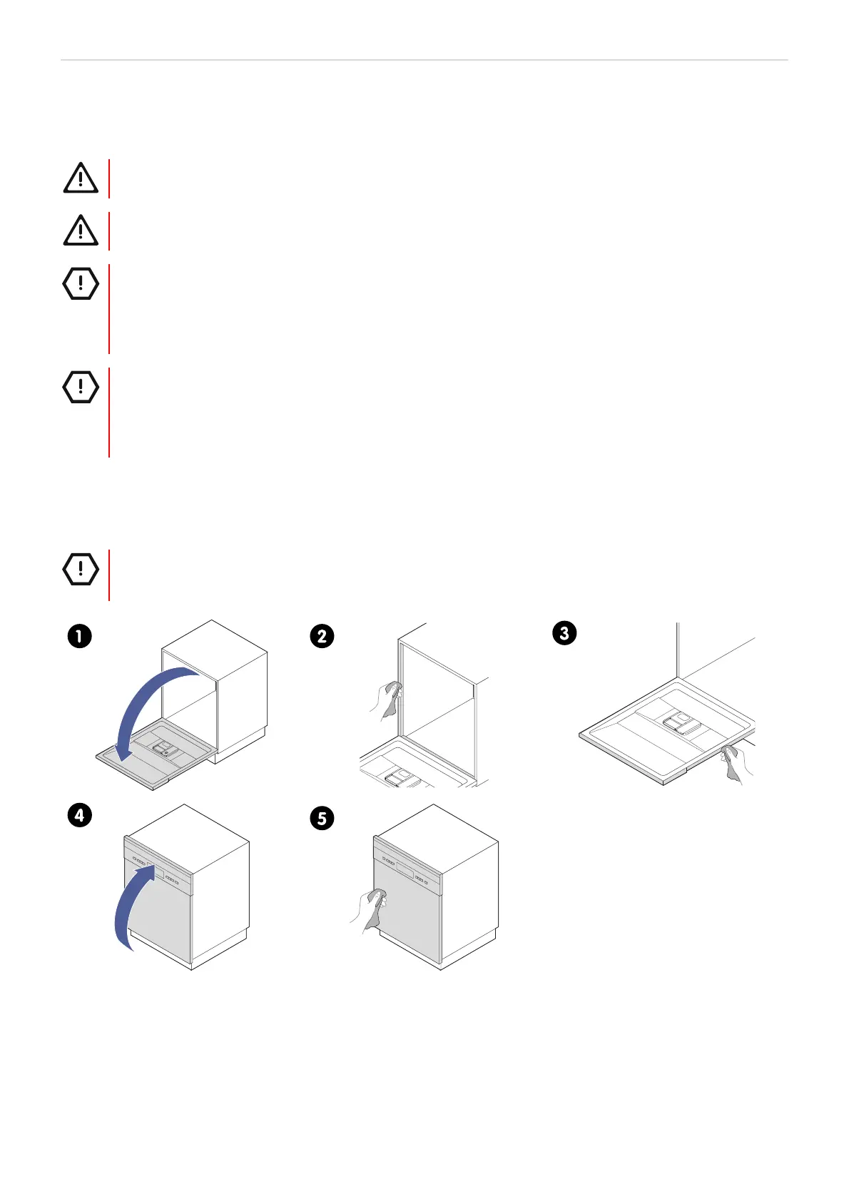 Brug ikke opløsningsmidler eller slibende rengøringsmidler til at rengøre opvaskemaskinens yderside eller