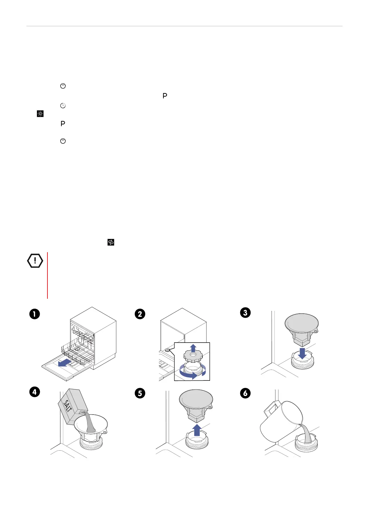 • Fyll kun på salt umiddelbart før du kjører et program. Søl av salt eller saltvann som blir liggende igjen i