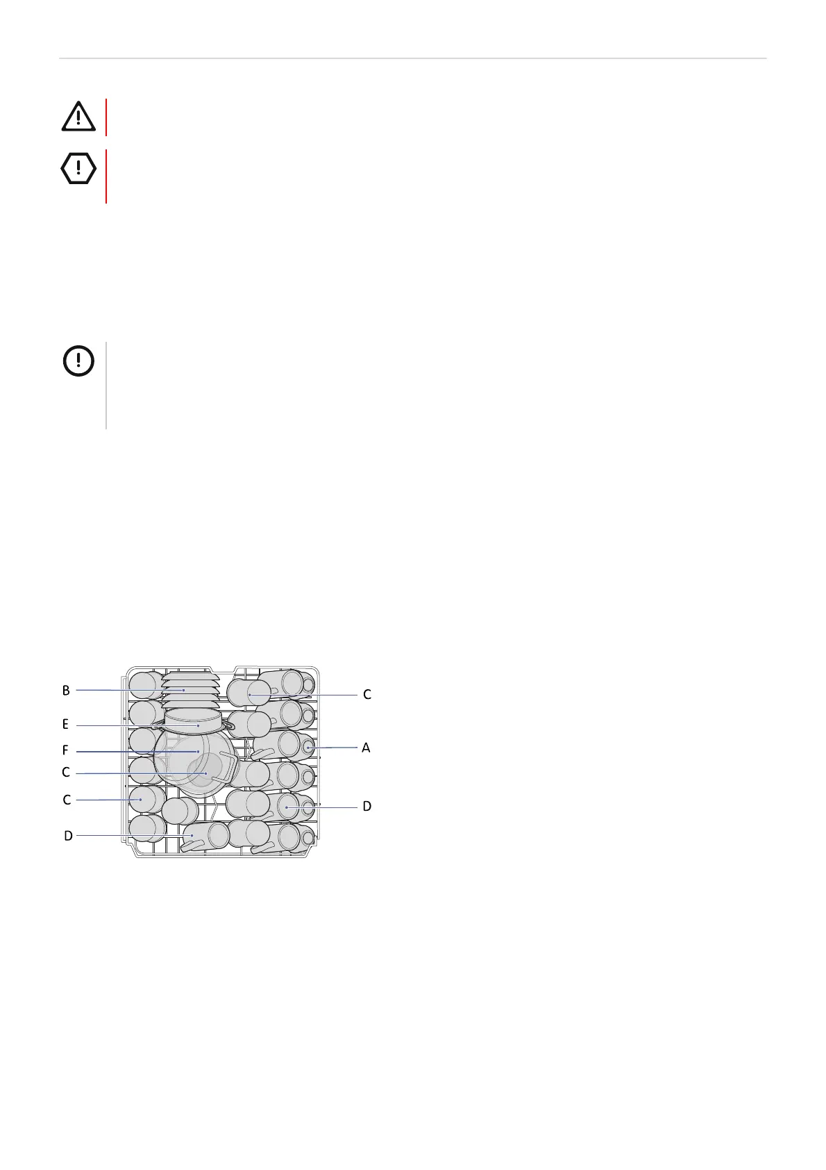 • Alle redskaber bør placeres, så de ikke står i vejen for, at spulearmene kan dreje frit rundt under vaskecyklussen.